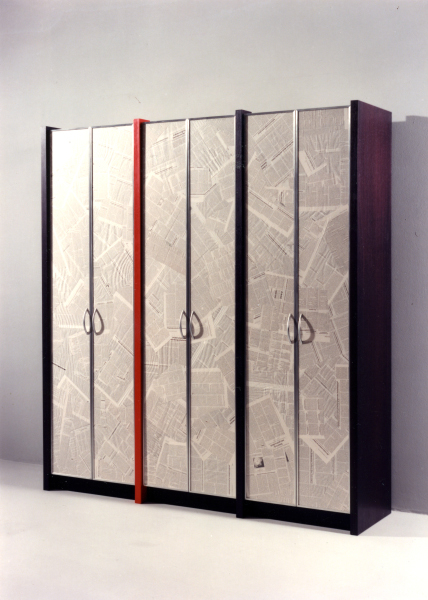 Ob Fototapete oder Kinderbilder, alles ist zur Gestaltung möglich und veränderbar mit den Türen als Wechselrahmen. Hier korreliert Zeitungspapier mit dem Werkstoff Holz und lässt mit der Buchstabenwüste die Türfläche kühl betont.