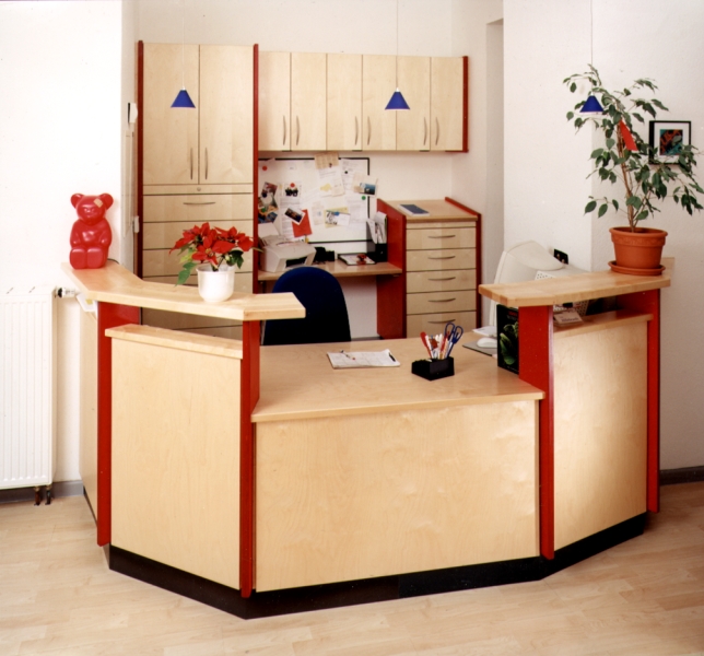 Der Einschnitt in der Theke erlaubt dem Kind einen Blick auf den Gesprächspartner der Eltern. Das helle Birkenfurnier und die rot gebeizten Multiplex Hölzer lassen dem Raum in einer fröhlichen Helligkeit. Dies Alles erleichtert den Beginn eines Kinderarzt Besuchs.